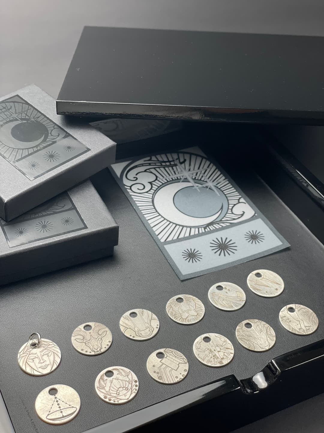 Die perfekte Synthese aus Kunst und Handwerk: 12 Sternzeichen als gravierte Silber-Medaillons.